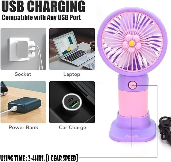 Enjoy instant cooling with this portable mini USB fan. Designed with a powerful motor, it’s perfect for drying makeup, personal cooling, and daily use. Rechargeable and lightweight with a convenient table dock stand. Cute and safe design makes it ideal for women and children—perfect for home, office, or outdoor travel.